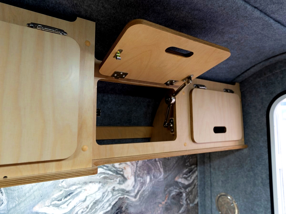 ● Спальная зона: Рундуки с секционными матрасами, трансформируемые в двуспальную кровать (1930x1300 мм). Обеденный стол на "ломаной" ножке.