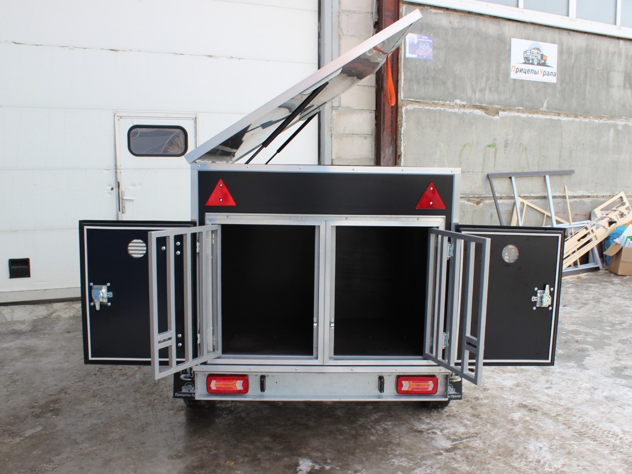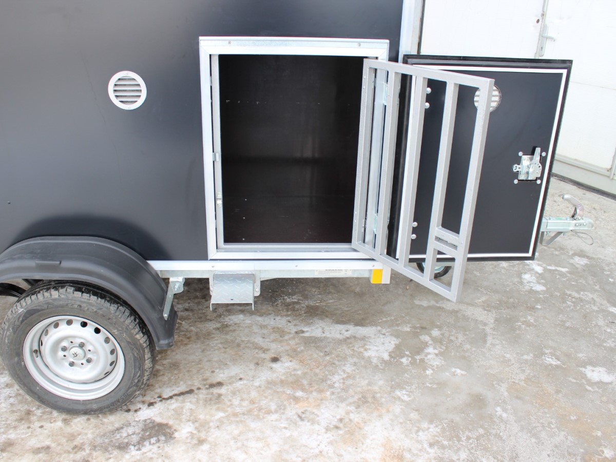 Для удобства открывания основных дверей прицепа предусмотрены дополнительные дверные решетки с запорной фурнитурой. Двери и корпус изготовлены из композитных панелей, что обеспечивает фургону устойчивость к агрессивной дорожной среде и делает его комфортным для использования в различных погодных условиях. Зимой в прицепе будет тепло, а летом — прохладно. Отсеки выполнены из водостойкой фанеры и имеют алюминиевые вентиляционные решетки. Двери и багажный отсек оснащены встроенными замками. Основание прицепа также выполнено из водостойкой ламинированной фанеры, которая легко моется и не впитывает запахи. Основание дополнительно утеплено экструдированным пенополистиролом.
