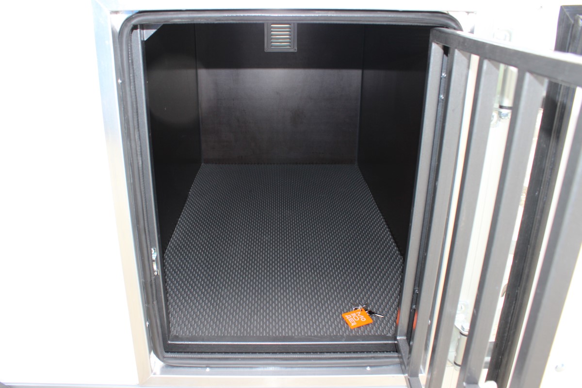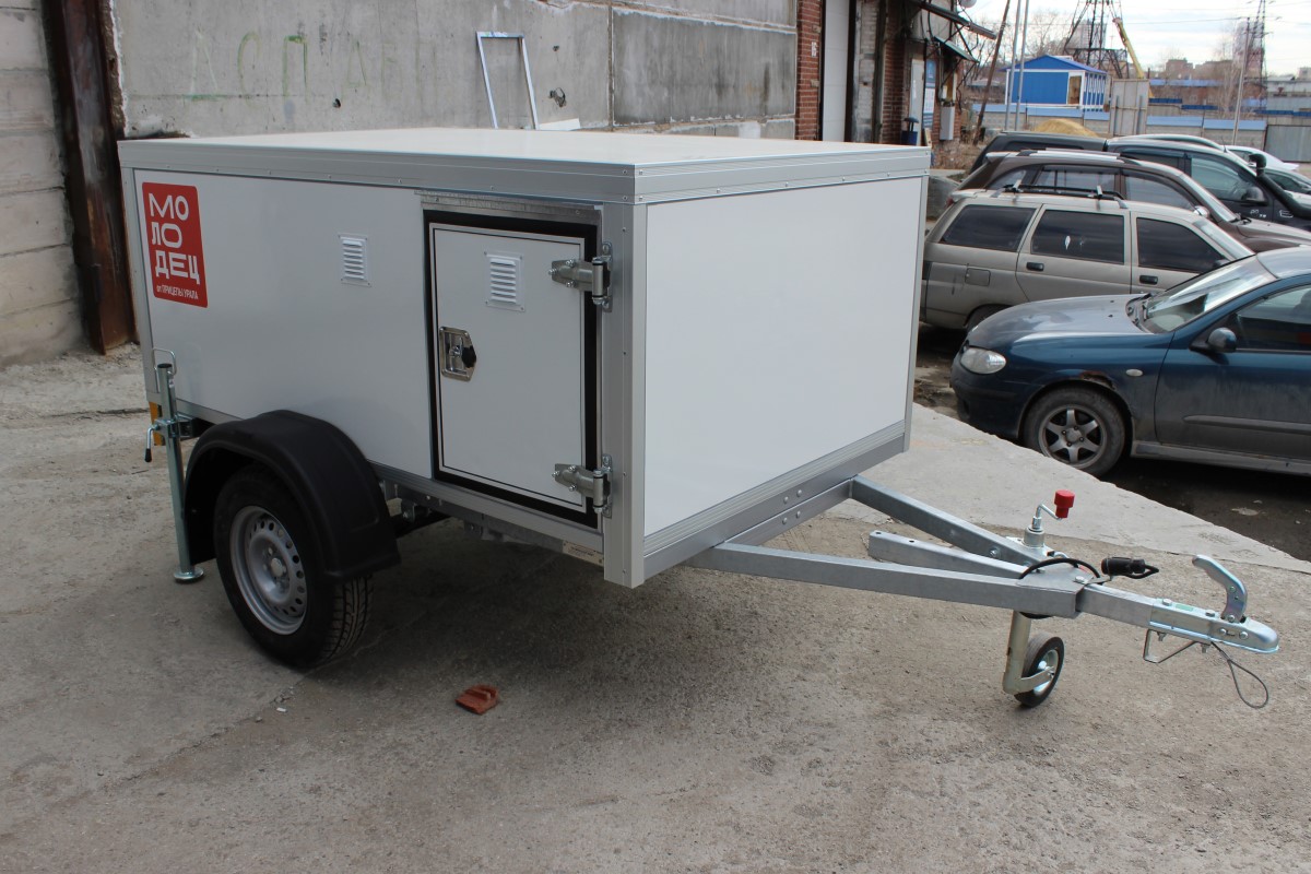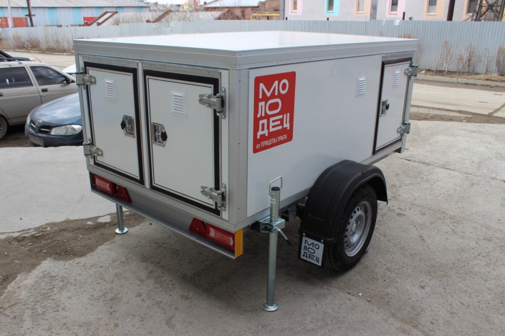 Для удобства открывания основных дверей прицепа предусмотрены дополнительные дверные решетки с запорной фурнитурой. Двери и корпус изготовлены из композитных панелей, что обеспечивает фургону устойчивость к агрессивной дорожной среде и делает его комфортным для использования в различных погодных условиях. Зимой в прицепе будет тепло, а летом — прохладно. Отсеки выполнены из водостойкой фанеры и имеют алюминиевые вентиляционные решетки. Двери и багажный отсек оснащены встроенными замками. Основание прицепа также выполнено из водостойкой ламинированной фанеры, которая легко моется и не впитывает запахи. Основание дополнительно утеплено экструдированным пенополистиролом.