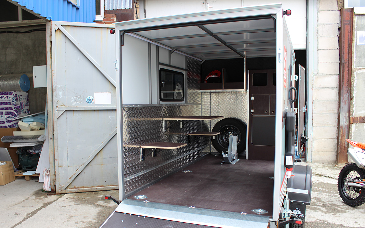 Прицеп «Мото-фургон» — это новейшая разработка нашей компании, предназначенная для любителей активного отдыха. Он сочетает в себе функции перевозки мототехники и комфортного пребывания внутри. Для удобства использования в качестве автодома в конструкции предусмотрена мебель для хранения необходимых вещей и комфортного времяпровождения, функциональная система хранения, которая позволит не только перевезти необходимый инструмент, но и осуществить ремонтные работы в комфортных условиях, стол, стулья и инструментальный ящик поможет с этой задачей.